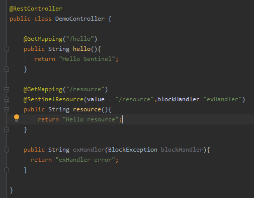 @GetMapping(“/resource”) @SentinelResource(“/resource”) public String resource(){ return “Hello resource”; }1
